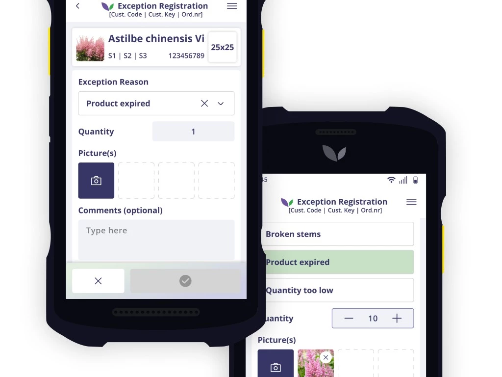Schade, kwaliteitsproblemen, ontbrekende aantallen of andere bijzonderheden in uw producten of partijen? Met de Exception Registration App registreert u gemakkelijk eventuele afwijkingen, zónder onderbreking van de werkzaamheden of het verstoren van de workflow!